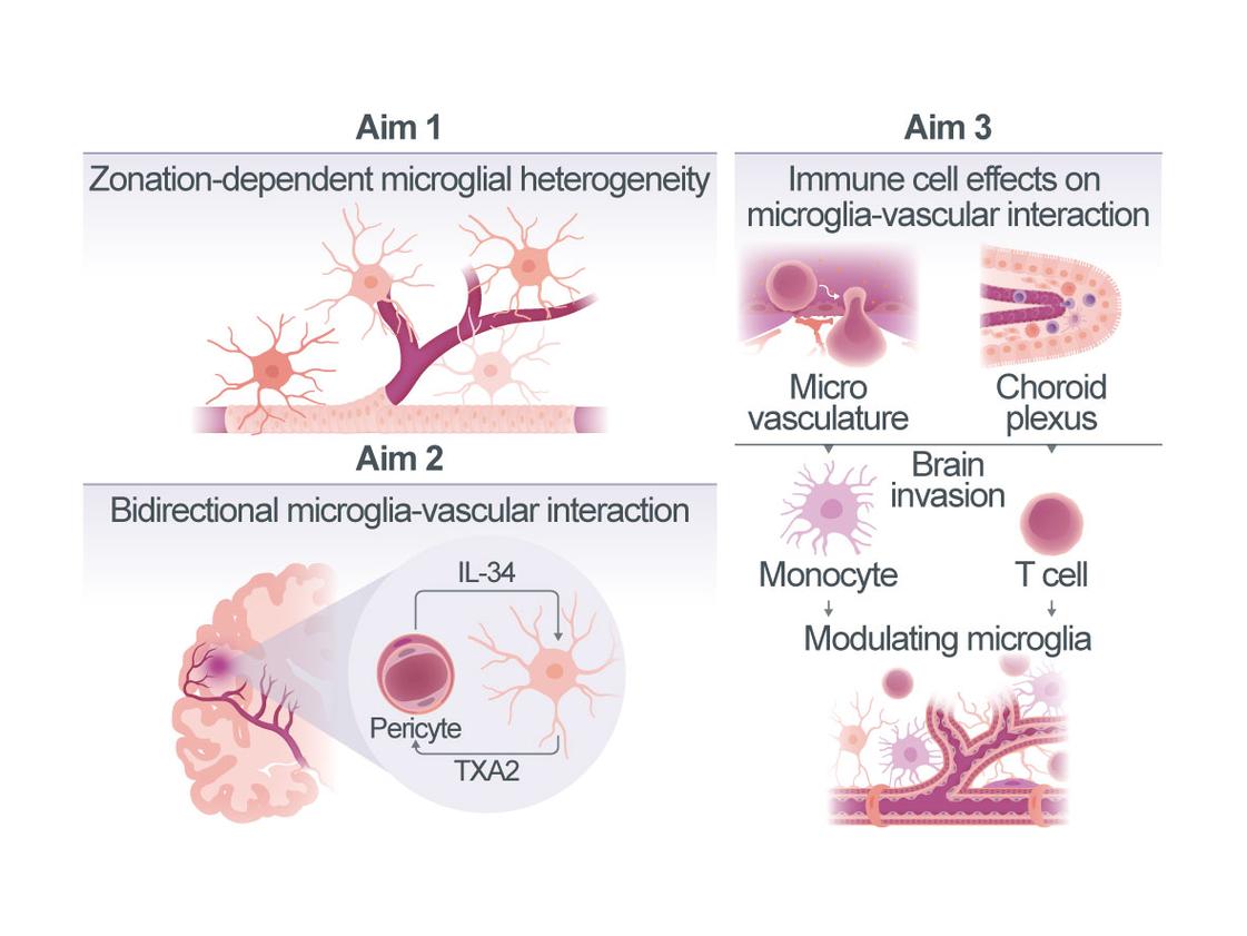 Our preliminary data reveal a novel functional axis between microglia and pericytes in the post-stroke brain: microglia release thromboxane A2 (TXA2), a potent vasoconstrictor that we found to act on Thromboxane receptors selectively expressed in the brain by pericytes, while pericytes in turn produce IL-34, a trophic factor acting via microglial CSF1R to modulate microglial reactive cell states. These interactions suggest the existence of a dynamic feedback loop that controls local vascular tone and neurovascular coupling. Notably, both TXA2 and IL-34 appear to operate in a zonation-specific fashion, confined to the microvascular level.