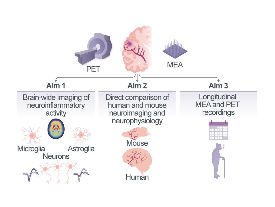 Neurovascular diseases (NVDs) including stroke are a leading cause of death and disability. The reorganization of neuronal networks and thus the extent of recovery from stroke are governed by complex interactions between neurons and multiple other cell types (vascular, immune and glial) in distinct cellular compartments of the central nervous system. Neuroinflammation with activation of astrocytes and microglia is heavily implicated in the pathophysiology of ischemic stroke and one of the key factors influencing functional outcome1, 2. However, significant medical and technical challenges limit the study of these processes in humans, leaving our understanding of how stroke-induced inflammation affects human neuronal activity and circuit function very limited. In this project, we will use neuronal recordings with cellular resolution directly from the human brain and molecular imaging of inflammatory activity to provide first-of-its-kind insights into the crosstalk between the human micro- and astroglial compartment and populations of individual neurons and their cortical networks in NVD. We will (i) combine large-scale electrophysiological recordings of single-neuron activity with structural and functional MRI and PET imaging of neuroinflammatory responses in patients with chronic ischemic stroke. We will explore associations between the levels of micro- and astroglial activation and single-neuron activity and neuronal network viability both in perilesional brain areas and in distant, anatomically connected brain areas; (ii) perform the same multimodal measurements in mice after experimental stroke, which will allow us to verify the measured PET signals using cell sorting and FACS after radiotracer injection, histology and immunohistochemistry; (iii) include longitudinal measurements of microglial, astroglial and neuronal activity in both humans and mice and link these with measures of functional recovery after stroke. We expect this project will shed new light onto the long-standing question of whether stroke-induced neuroinflammatory responses are protective or harmful for human brain reorganization.