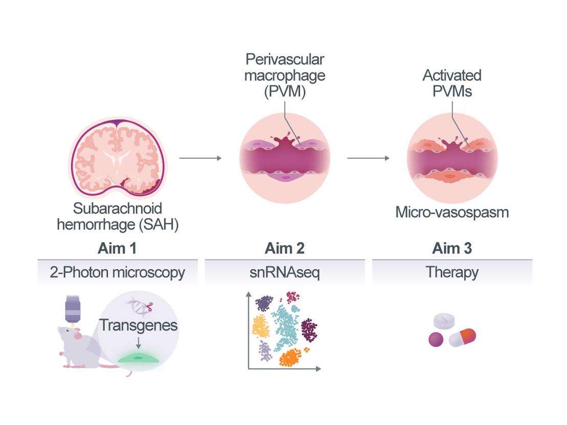 Therefore, the main aim of the current project is to decipher the molecular mechanisms by which PVMs interact with the vascular wall (pericytes, endothelial and smooth muscle cells) and adjacent parenchymal cells (astrocytes and neurons) to cause microvasospasm and microvascular dysfunction after SAH (cellular zonation). Further, we will try to understand how blood in the subarachnoid space is able to induce dysfunction in specific segments of the cerebral vasculature, i.e. cerebral capillaries (vascular zonation). To this end, we will investigate the morphological and functional changes of PVM after SAH by longitudinal in vivo multiphoton microscopy (Aim 1) and identify the genes and pathways activated in PVM and their neighbouring cells (endothelium, mural cells, astrocytes, and microglia) by single nucleus RNA sequencing (Aim 2). Using this knowledge, we will validate novel therapeutic strategies for the treatment of microvascular dysfunction following haemorrhage (Aim 3).