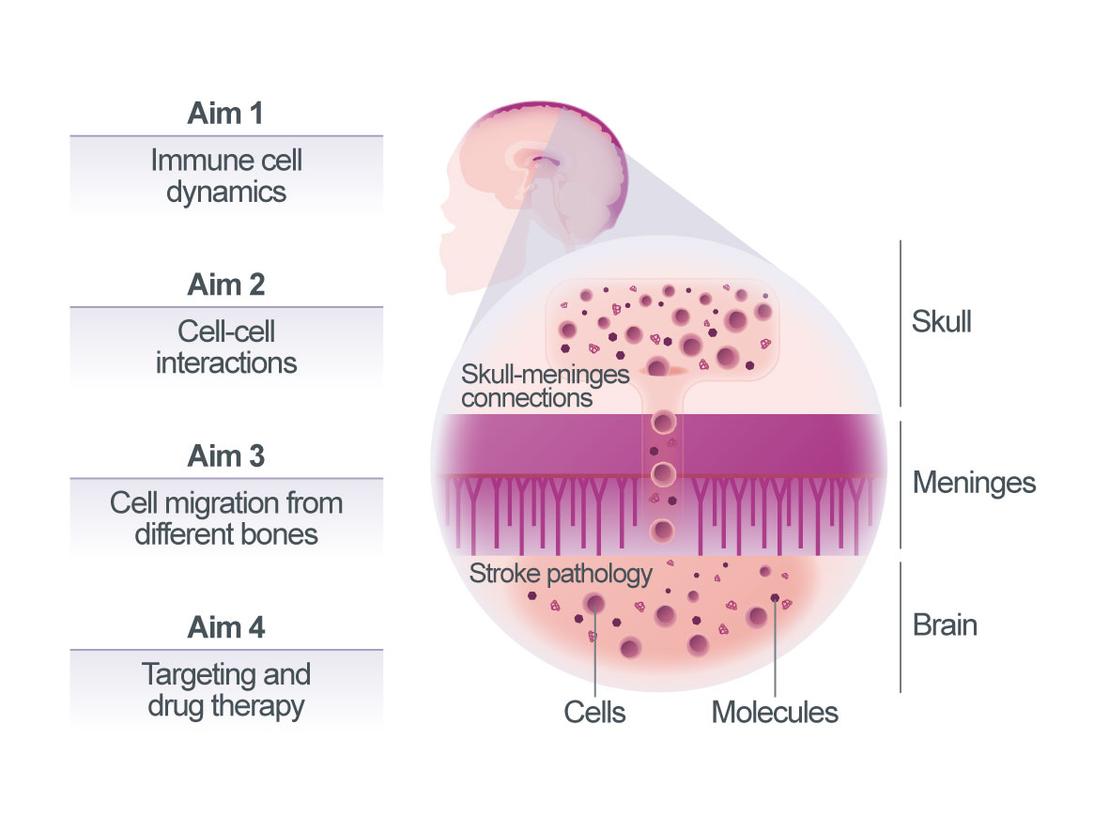 We and others have recently discovered the close connections between the brain and the skull bone marrow through skull-meninges connections (SMCs). These SMCs are functionally important, as shown by a distinct expression profile of skull-resident immune cells. After the stroke, these cells show increased trafficking through SMCs, alongside activation. In patients, a skull-specific TSPO-PET signal correlates with disease severity across multiple neurological conditions1. To investigate the functional relevance of skull bone marrow for stroke outcome, we will pursue four aims: